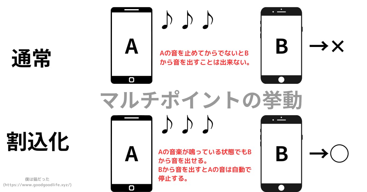 Bで音楽を流したい場合はAの音楽を止めてから出ないといけません。