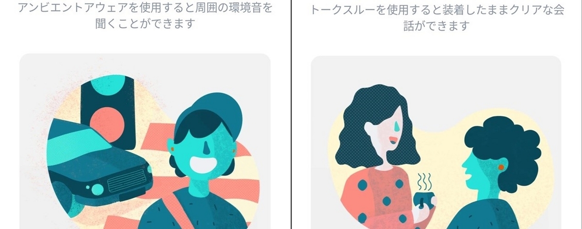 アンビエントアウェアとトークスルーの2種類の外音取り込みモードが用意されています。