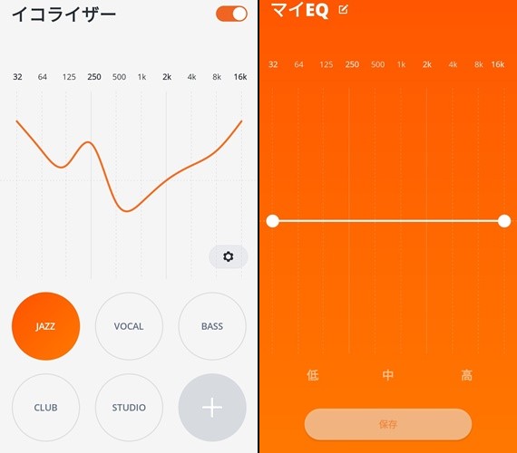 5つのプリセットとカスタムEQで自分好みに設定することもできます。